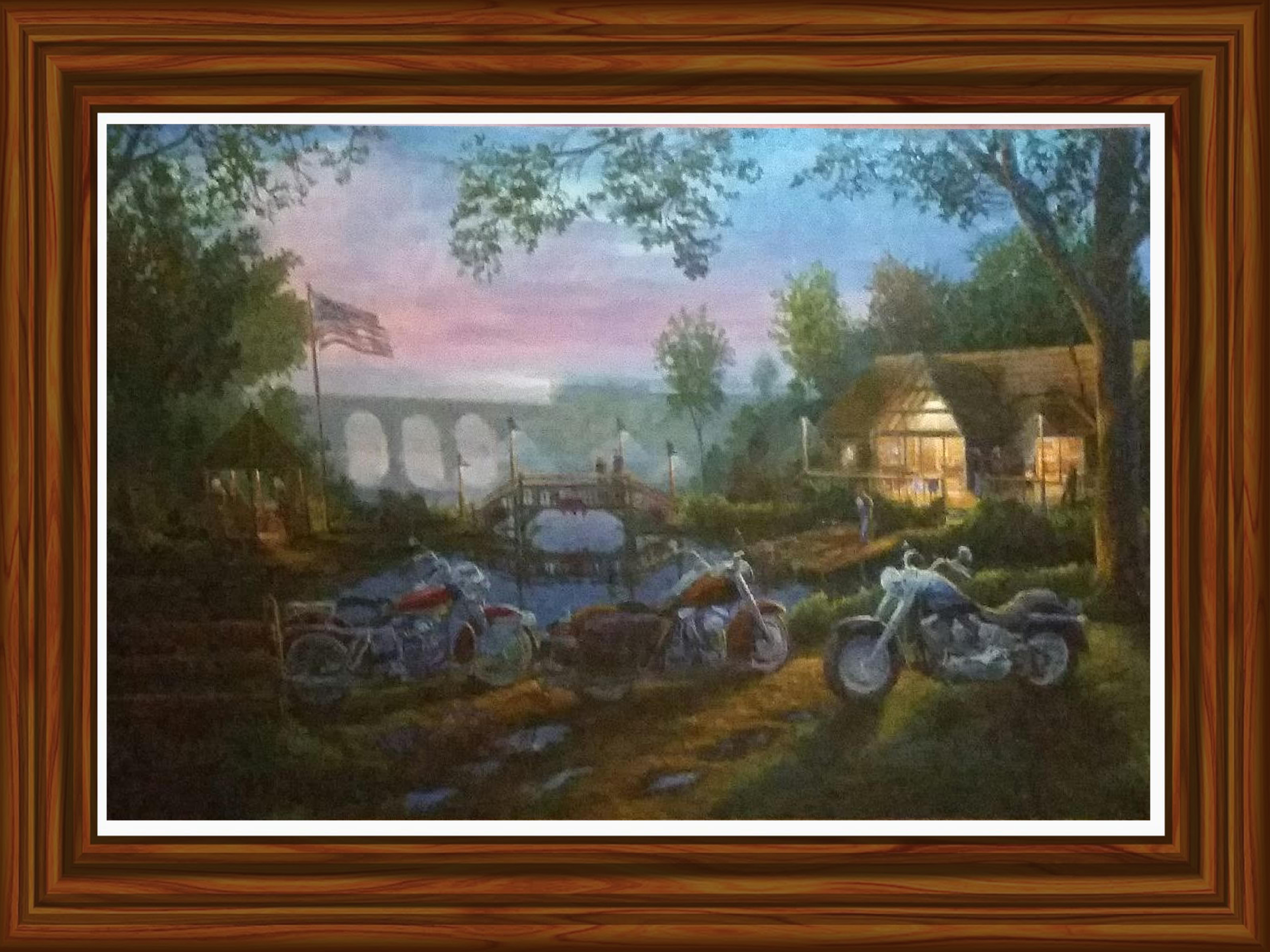 | “American Iron”is a painting about the freedoms we enjoy in America, (Statue of Liberty hidden in the tree above the gazebo). Freedoms hard won by previous Americans. (hidden image above the cabin of Marines raising the American flag on Iwo Jima).  As the whistle from the diesel locomotive echoes through the valley people gather at a beautiful riverside cabin. Talk around the grill includes stories of an annual pilgrimage to the Black Hills of South Dakota, (Mount Rushmore hidden in the sky). The painting “American Iron” is not so much about the machines we build, this limited edition print would be a great addition to your home or office. |