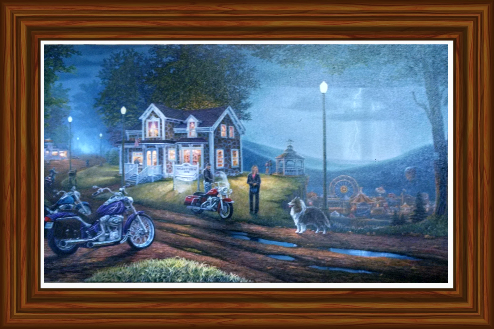 | Lightning shimmers across the valley from the distance storm. Thunder will not stop the young couple form taking a ride down the valley to enjoy activities at the county fair. There are many stories in this incredible panoramic landscape. A collie wanders on his own while his owners wonder where he is. Motorcyclists are often thought of as living life on the edge, like others in this magnificent oil painting, (including hidden images of Marlon Brando as a post WWII biker, two 1960's adventurers looking for America, a cowboy, and Native American leader Geronimo who succeeded in evading federal authorities for 25 years). “Riders on the Storm” celebrates the courageous individual who fearlessly follows his own path, and the warriors, (Geronimo and the hidden soldier in the storm), who's loyalty sends him, (and her), into harms way to do battle for others. Purchase of your limited edition print will directly benefit our American Veterans wounded in the Iraq war through the nonprofit “Fisher House” Foundation. As more troops return from war zones needed long term care, “Fisher House” Foundation is proving to be a valuable resource for wounded Veterans and their families. Display this beautiful panoramic print in your home today and help our brave soldiers.