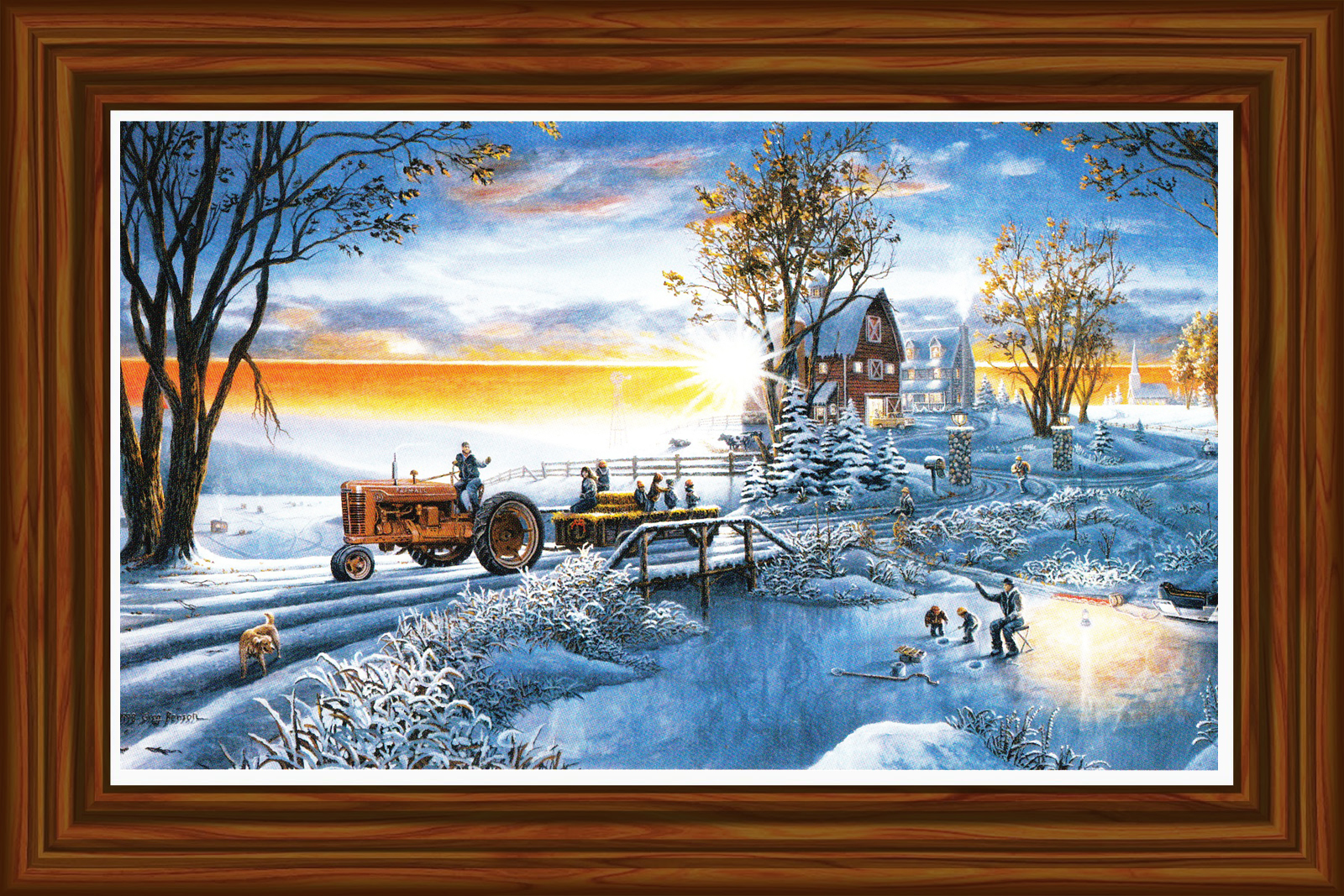 | The brilliant evening light highlights the joy of a winter hayride. Two children on their first ice fishing adventure look down the mysterious hole wondering, “are there fish really down there?” Two boys want to catch up and get into the wagon while a third is likely to be the next one pushed off. American's have always found ways to play in the winter and many are descended from European immigrants who brought their traditions of winter activities with them. If you look closely you may find hidden images of two men enjoying the sports of curling, a woman ice skating, and a man skiing.