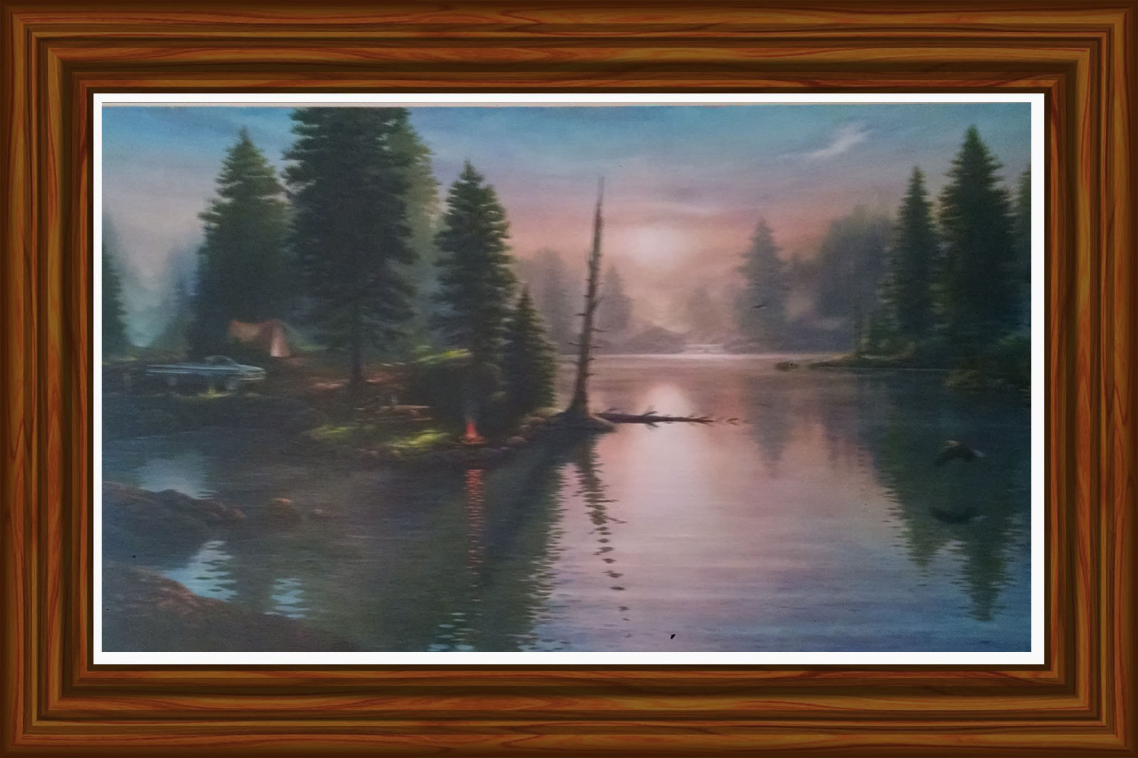 | The evening sun shimmers across the river as eagles glide along it's banks. A campfire crackles while several deer keep a watchful eye on the camp across the river. The people camping are not the first visitors to this beautiful place. The introduction of the model T (hidden image on the left), made recreational travel more available to everyone. Even earlier visitors, (cowboy in wagon behind team of horses above campsite and Native American on horse hidden on right), also passed through this peaceful place. You can enjoy this relaxing setting everyday when you add this magnificent scene to your collection.