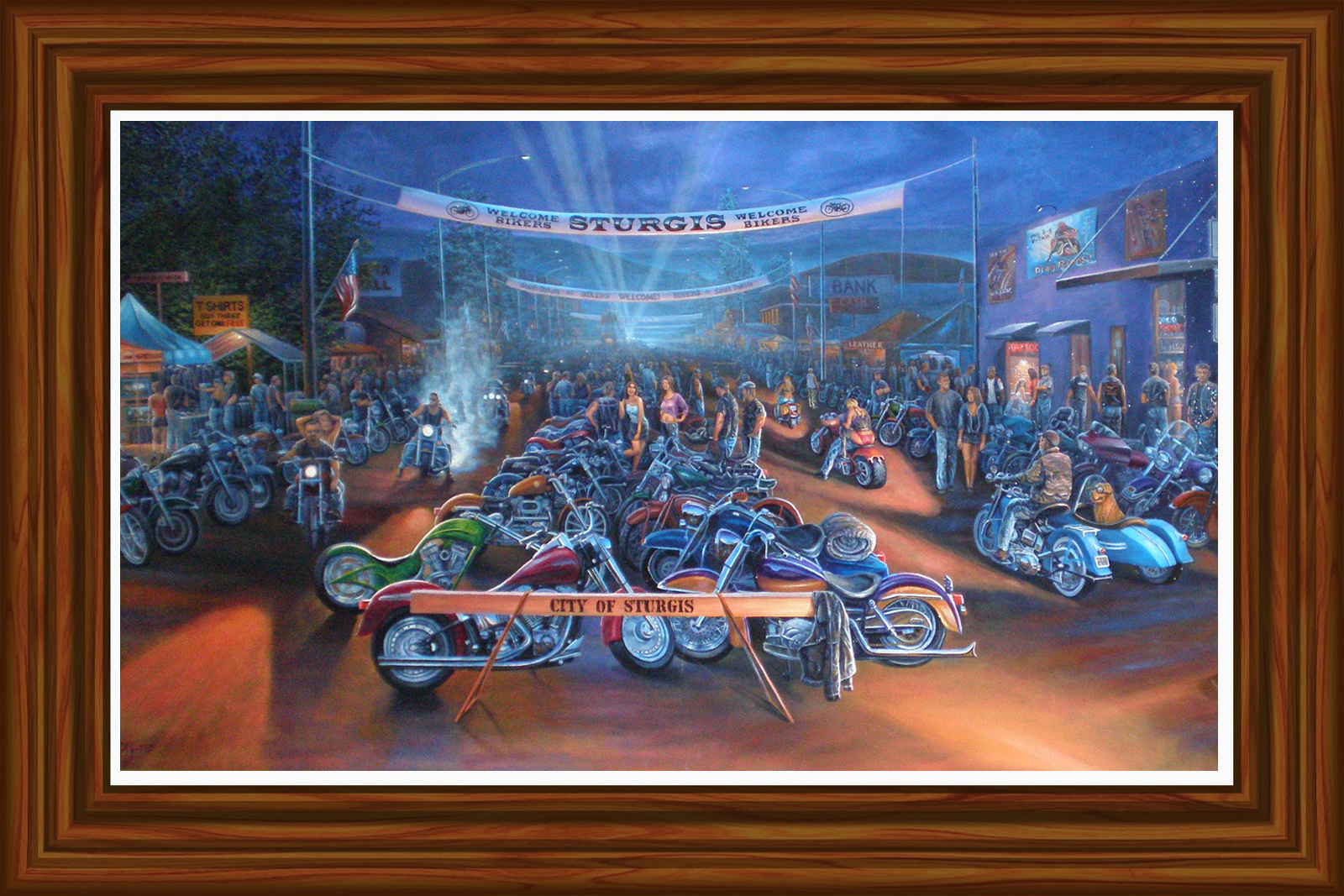 | This incredible panoramic vision of downtown Sturgis during rally week is certainly one of the most unique pieces of motorcycle art ever created. When you look at this painting you can feel the excitement of being on main street at night. The amount of detail in this image is stunning and Greg Benson's creative use of hidden images adds even more levels to this unique story painting.