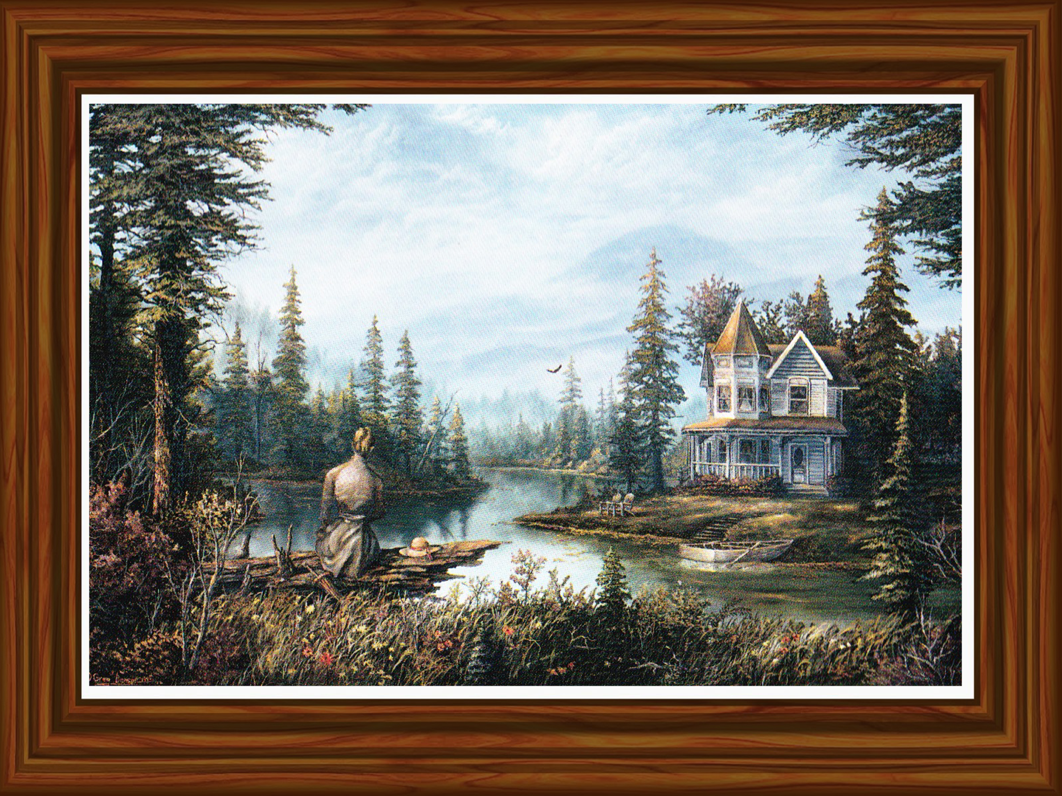 A young woman sits on a fallen tree and watches an eagle soar through the mountain valley. Her Victorian clothing tells us this is another time. We can only wonder what she is thinking as she observes the beautiful surroundings.