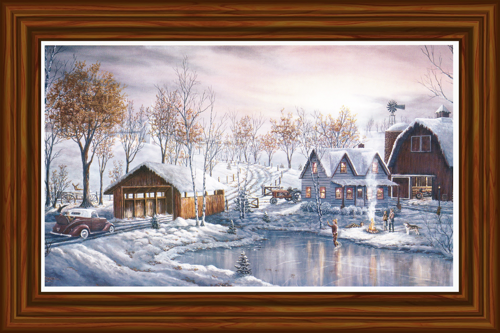 | The early winter ice is smooth and the warm fire crackles as the sun sets on the farm. Winter can be the season when families come together and and share their favorite memories of past good times. In earlier days pioneer families (hidden image on the right) visited by stagecoach (hidden image in the tree on the left) instead of automobiles. Perhaps a Native American passed by in a canoe, (hidden image in the creek). For many, winter brings back great memories. Skating, sledding and family get togethers can be the best of times.